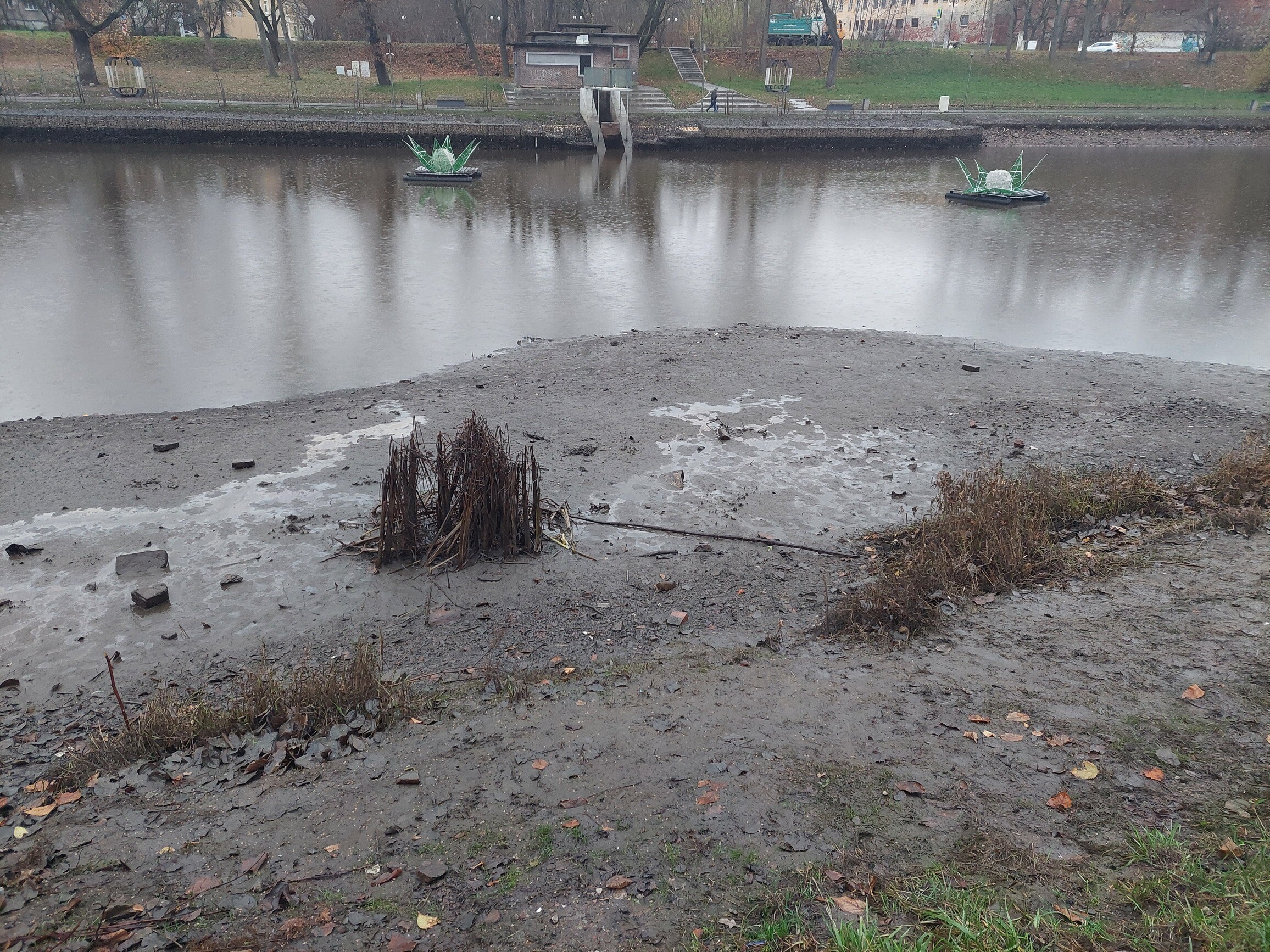 на садовой продолжение ковыряний - завоз плитки. кусок садовой закончен в части тротуаров и освещения. тоннельная вокруг "у медведя" в процессе тротуарном. Если склероз мне не изменяет там бывали подтопления, но только весной и совсем небольшие - ну выходил чапаевский говносток немного из берегов, но не более того, а дожди никогда проблем не создавали. как не будет сделано тк нечего пилить. \ \\ сток должен быть организован через верх пластины для саморегуляции без опаздывающего ручного регулирования. берём сварщика из любого мупа. срезаем участок забора с верхней площадки там излишек и периметр вокруг штанги закроется. срезанные два куска устанавливаем вокруг пластины углом в озеро. на ограждении пластины рисуем пасть кита с катамарана из проката. бревно способное забить трубу остановит а мелкий мусор порубят винты катеров рыбной деревни ну а перемешивание фекалий лебедями произойдёт несколько ранее в бережковском. спустив всё решили проверить где же забито?